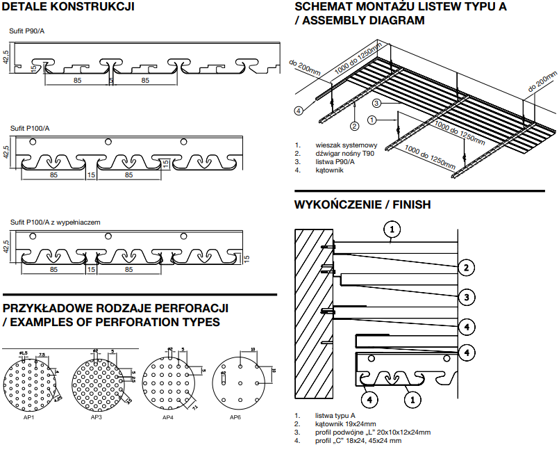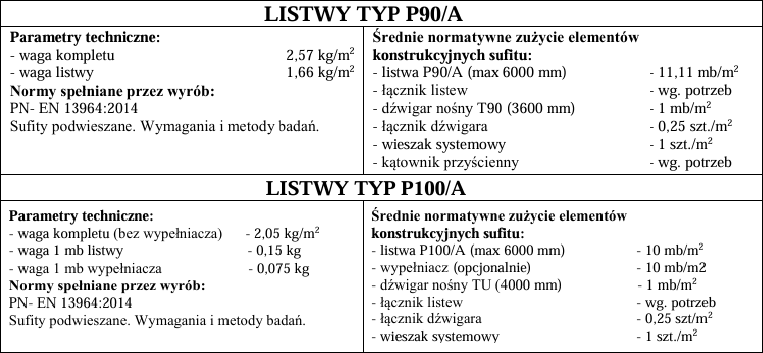 Grubość blachy ok. 0,5mm, wysokości profili 23/38/40/50mm, moduł paneli 600×600mm, aluminium, reakcja na ogień A1, kolory RAL.