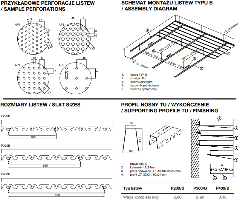 - Szerokości paneli: 200 mm, 300 mm, 400 mm. (P200B, P300B, P400B)