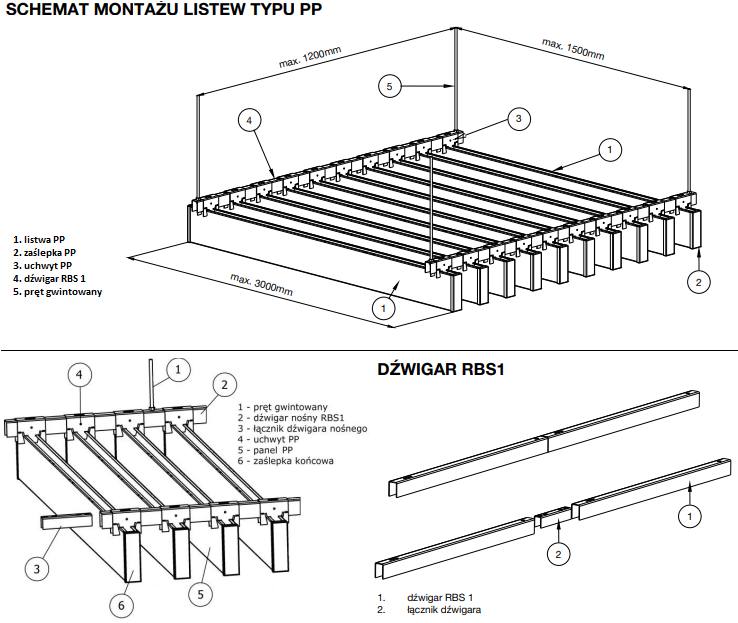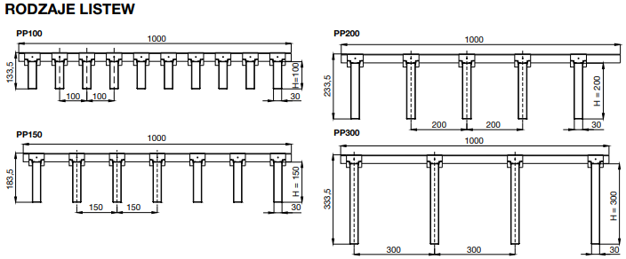- Wysokość profili (listew): dostępne cztery warianty (100 mm, 150 mm, 200 mm, 300 mm).