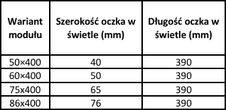 - Wymiary modułu: szerokość 50/60/75/86 mm, długość 400 mm
