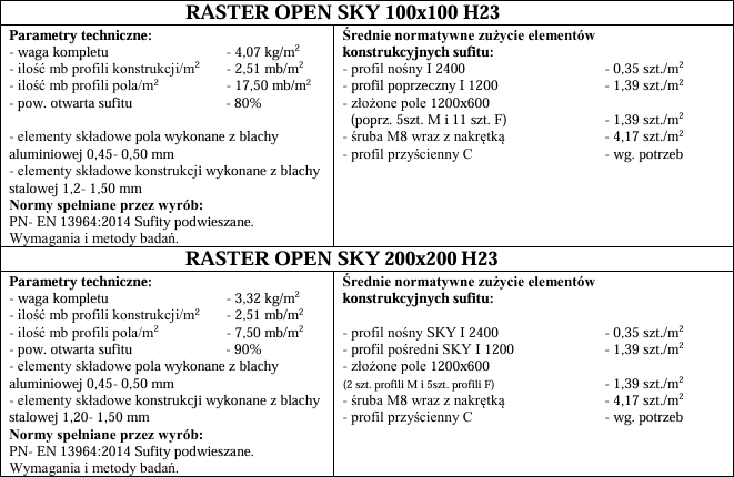 - Odporność na warunki zewnętrzne - dzięki stalowej konstrukcji i odpowiednim materiałom Open Sky sprawdzi się tam, gdzie inne sufity rastrowe zawiodłyby przy wietrze, deszczu czy zmiennej pogodzie.