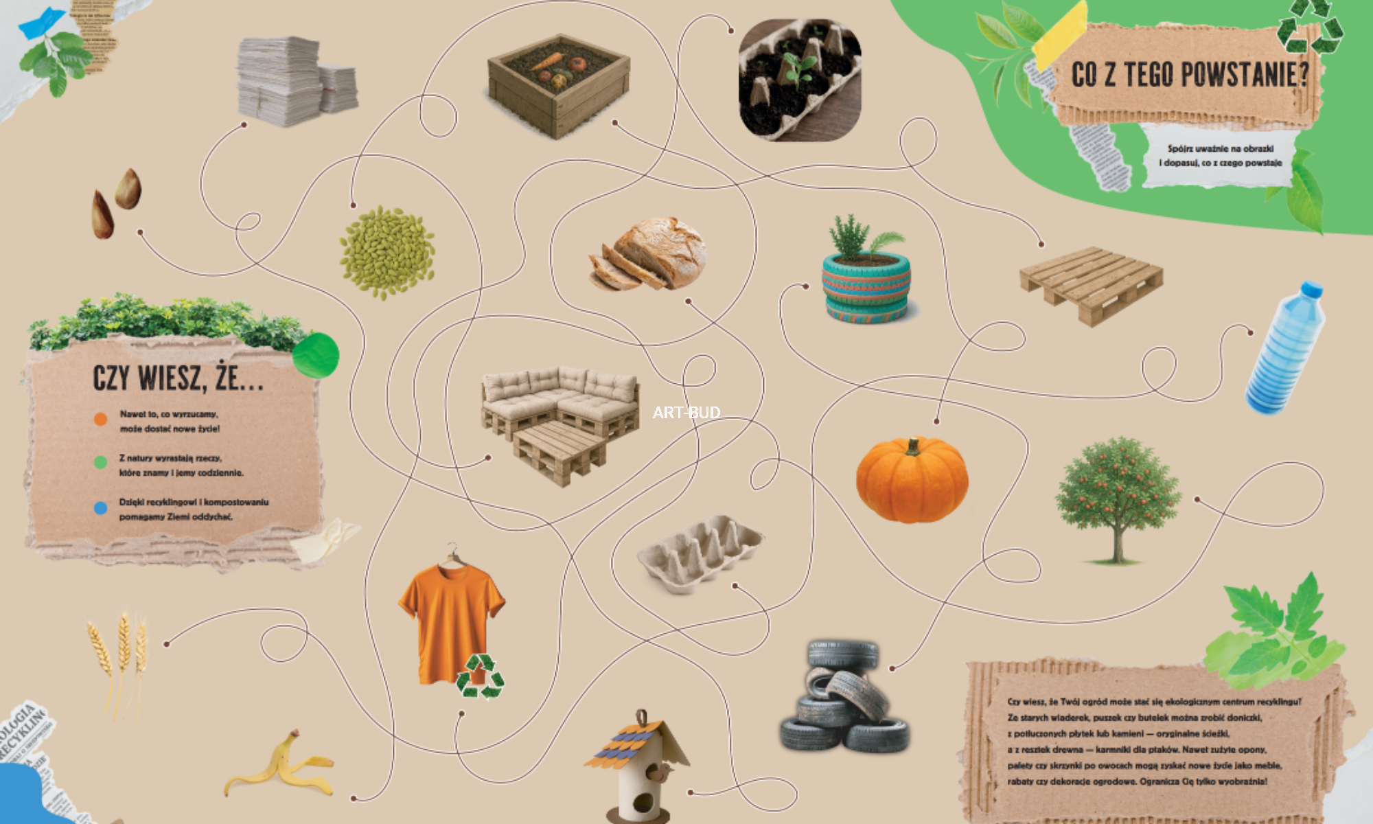 Tablica przedstawia popularne odpady oraz produkty, które powstają w wyniku ich przetworzenia. Dzięki jasnym grafikom i dużej powierzchni ilustracyjnej, dzieci mogą samodzielnie odkrywać zależności i łączyć elementy recyklingowego cyklu życia przedmiotów.