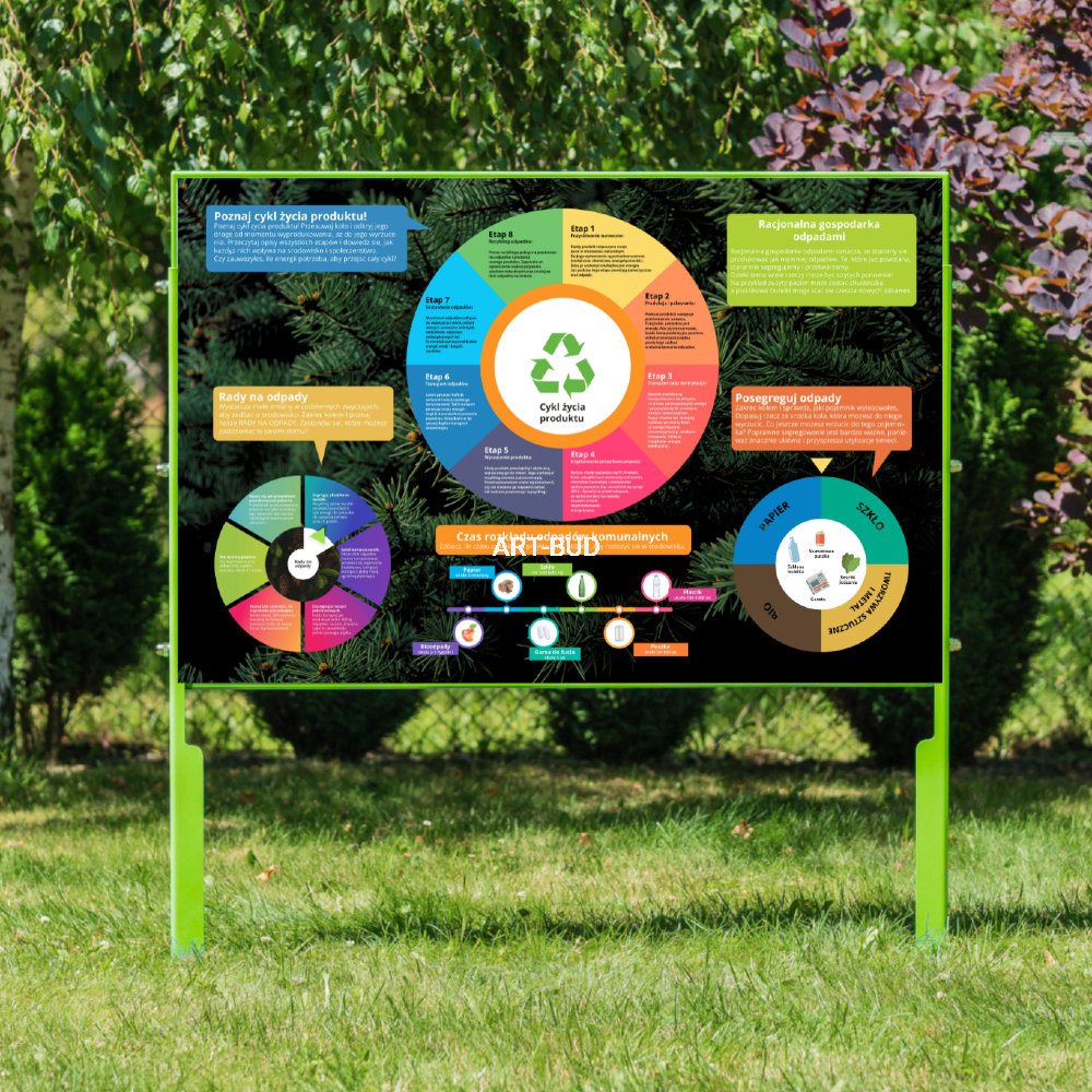 Tablica edukacyjna Cykl życia produktów to nowoczesne narzędzie dydaktyczne przeznaczone dla szkolnych ekopracowni, terenów edukacyjnych, zielonych klas, ogrodów przyszkolnych oraz placów zabaw. Dzięki trwałej konstrukcji outdoor i przejrzystemu układowi treści, tablica prezentuje wszystkie etapy życia wybranego produktu – od pozyskania surowców, przez produkcję i użytkowanie, aż po ponowne przetworzenie. To idealne wsparcie dla zajęć ekologicznych, lekcji o recyklingu i warsztatów przyrodniczych.