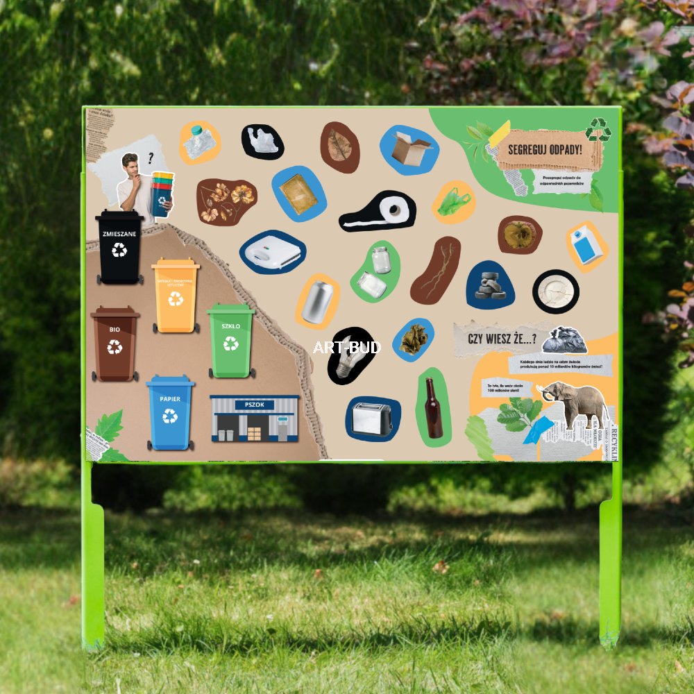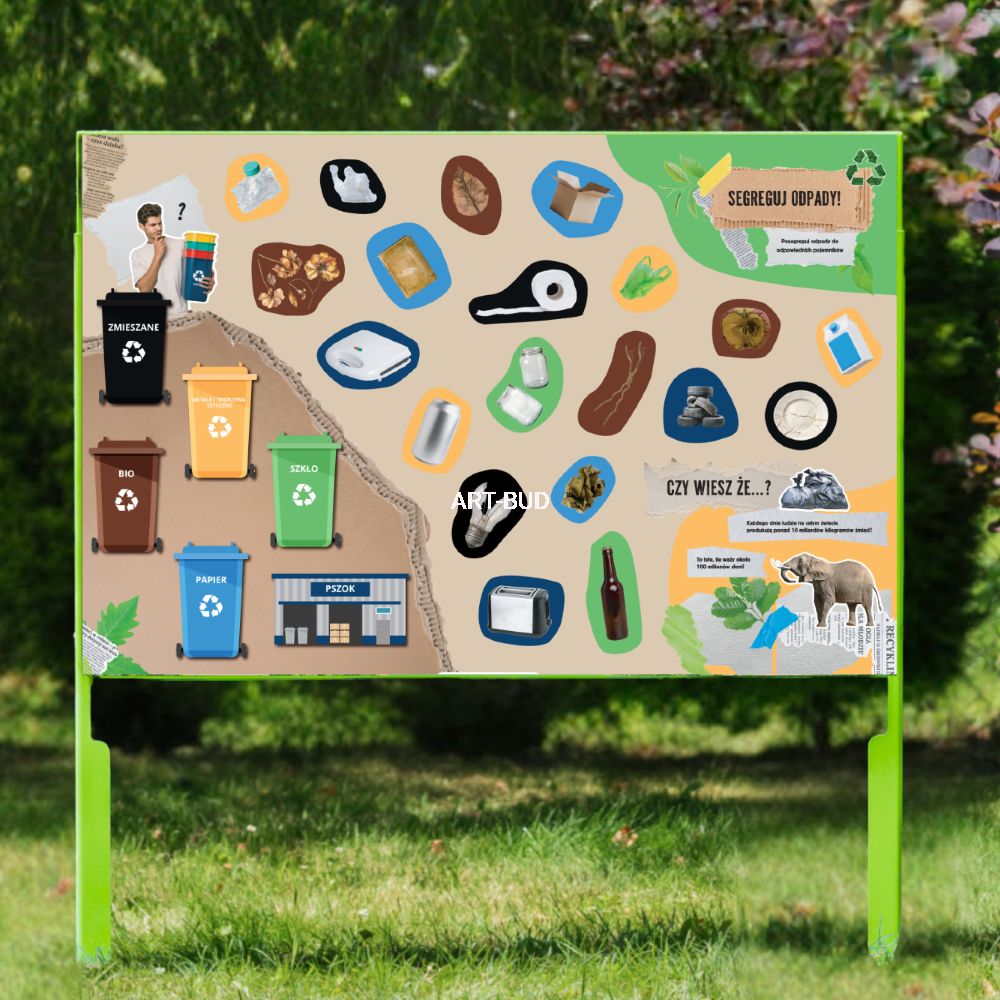 Tablica edukacyjna Nauka Segregacji to nowoczesny panel dydaktyczny, który uczy dzieci zasad segregowania odpadów i dbania o środowisko. Produkt jest przeznaczony dla przedszkoli, szkół, ekopracowni oraz placów zabaw, gdzie dzieci uczą się przez zabawę i praktyczne ćwiczenia. Dzięki tablicy najmłodsi poznają różne rodzaje odpadów, uczą się odpowiedzialności ekologicznej i rozwijają świadomość proekologiczną. Konstrukcja panelu wykonana jest z trwałych materiałów odpornych na warunki atmosferyczne, co pozwala na całoroczne użytkowanie na świeżym powietrzu. Elementy są bezpieczne, zaokrąglone i odporne na intensywną eksploatację.