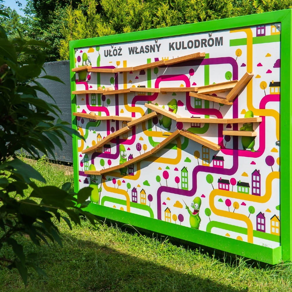 Tablica edukacyjna z kulodromem to nowoczesny, interaktywny panel sensoryczno–ruchowy przeznaczony do stref zabaw, edukacji i aktywności dzieci. Konstrukcja opiera się na trwałych płytach HDPE, które zapewniają odporność na warunki atmosferyczne, intensywne użytkowanie oraz promieniowanie UV. Kulodrom posiada ruchome elementy, dzięki którym dziecko może obserwować tor kulki, wpływać na jej prędkość, kierunek oraz zatrzymanie, rozwijając tym samym logiczne myślenie oraz koordynację wzrokowo-ruchową.