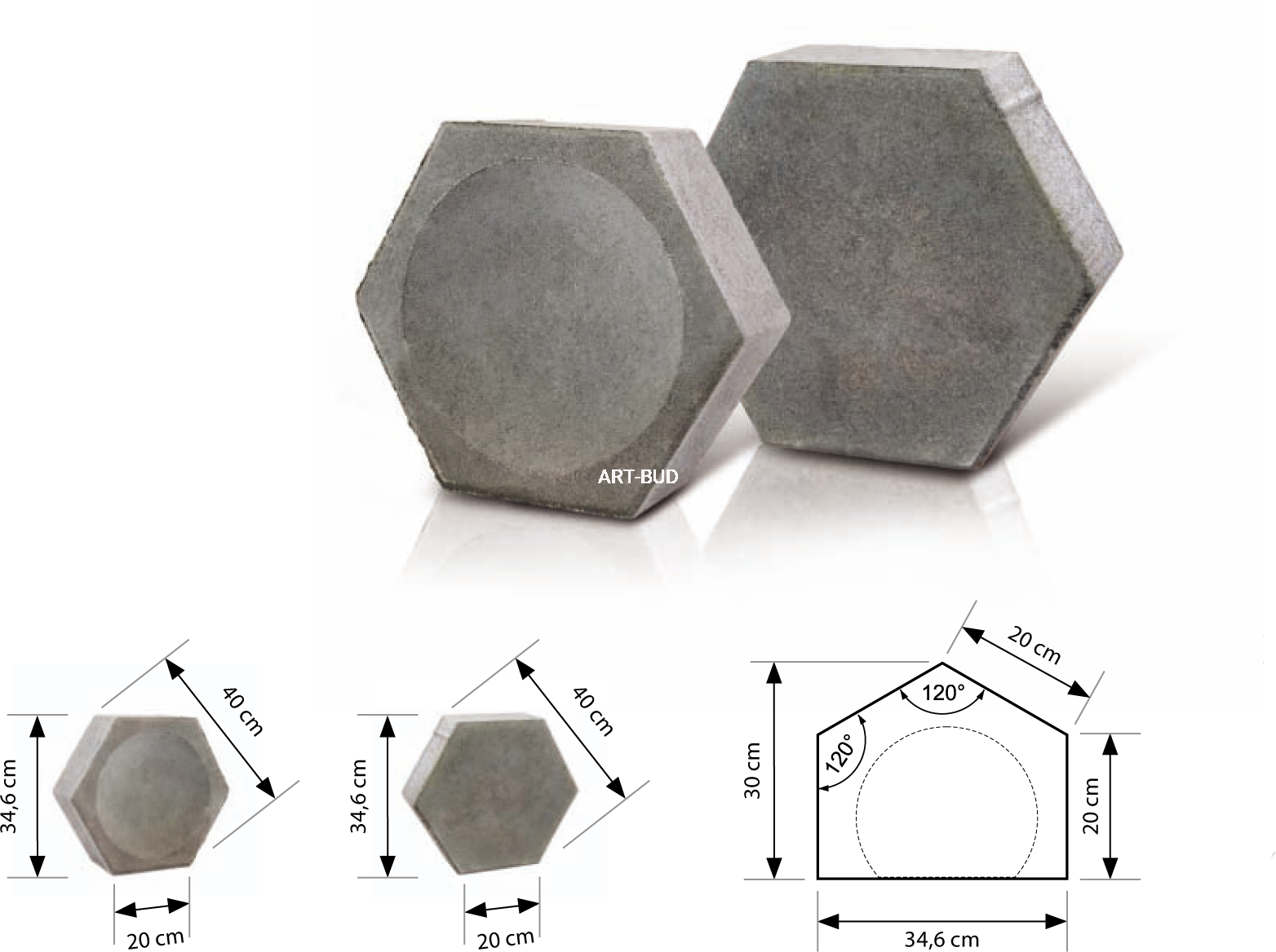 • Kształt: sześciokątne płyty betonowe, dostępne również w wersji wklęsłej.
