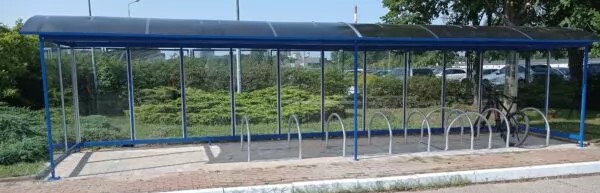 Przezroczyste wypełnienie ścian z poliwęglanu lub szkła sprawia, że konstrukcja pozostaje lekka wizualnie i dobrze komponuje się z otoczeniem. Wiata Lambda doskonale sprawdzi się przy budynkach mieszkalnych, szkołach, firmach, urzędach oraz na parkingach rowerowych.