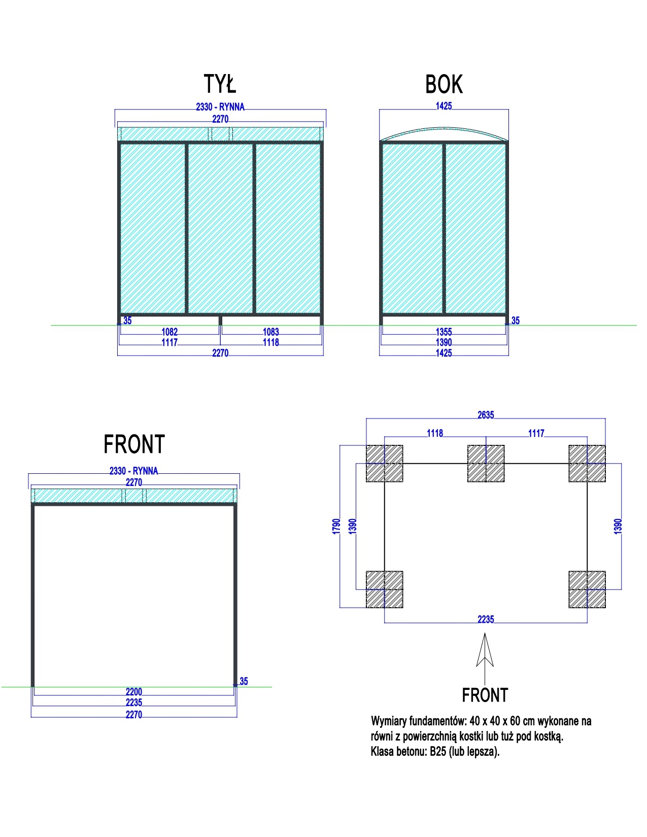 - Jeśli zamawiający chce wykonać fundament, min stopy 50 x 50 cm, głębokość 80 cm - w standardowych wiatach, zalecany B20