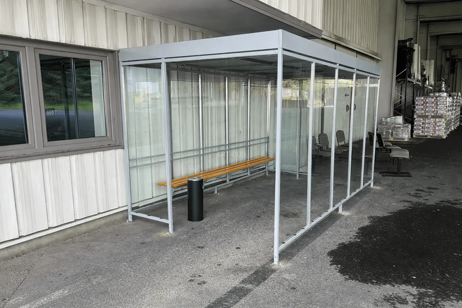 Dzięki estetycznemu wyglądowi wiata dla palących OMEGA 5 dobrze komponuje się z nowoczesną architekturą budynków biurowych, hal produkcyjnych czy centrów logistycznych.