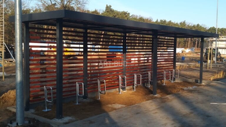 - W przypadku braku informacji dotyczącej stojaków rowerowych, wycena obejmuje wyłącznie konstrukcję wiaty wraz z podkładem cynkowym + malowaniem proszkowym, obicie dachu blachą trapezową, obicie ścian deskami, zgodnie z specyfikacją.