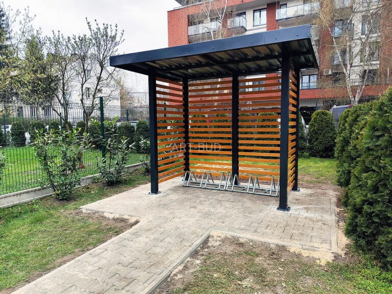 Stałe i uporządkowane miejsce do parkowania rowerów w przestrzeni publicznej oraz przy obiektach komercyjnych. Stalowa forma z dachem z blachy trapezowej i tylną osłoną z drewnianych listew chroni rowery przed warunkami atmosferycznymi i porządkuje otoczenie. Prosta bryła oraz stonowane materiały dobrze wpisują się w zabudowę miejską.