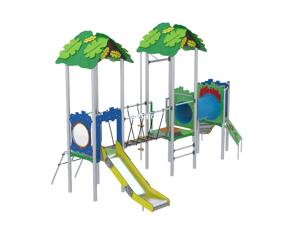 Zestaw zabawowy Jungle to rozbudowane urządzenie przeznaczone na place zabaw, które oferuje wiele możliwości aktywnej zabawy. Trzy wieże połączone różnorodnymi elementami oraz dwie zjeżdżalnie tworzą atrakcyjną i funkcjonalną przestrzeń dla dzieci.